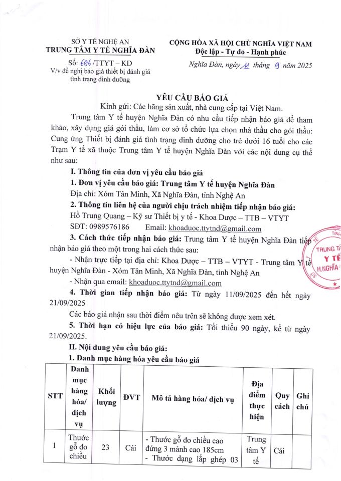 YÊU CẦU BÁO GIÁ THIẾT BỊ ĐÁNH GIÁ TÌNH TRẠNG DINH DƯỠNG CHO TRẺ DƯỚI 16 TUỔI