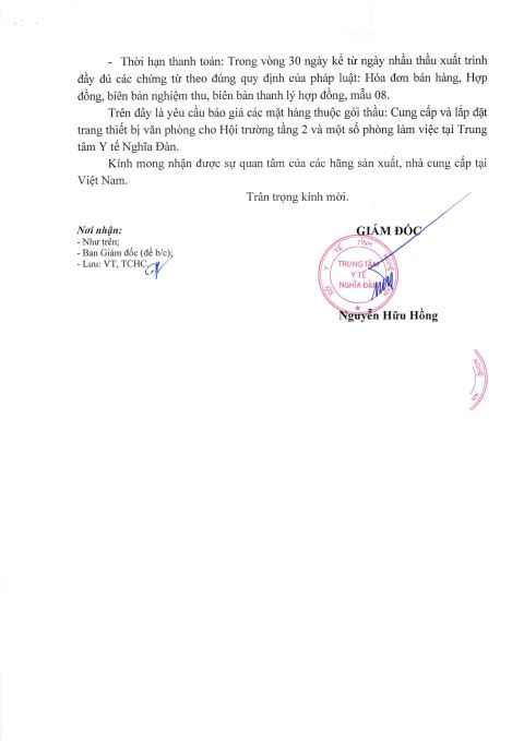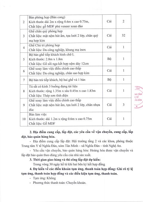 Trung tâm Y tế Nghĩa Đàn có nhu cầu tiếp nhận báo giá để tham khảo, xây dựng giá gói thầu, làm cơ sở tổ chức lựa chọn nhà thầu cho gói thầu: Cung cấp và lắp đặt trang thiết bị văn phòng cho Hội trường tầng 2 và một số phòng làm việc